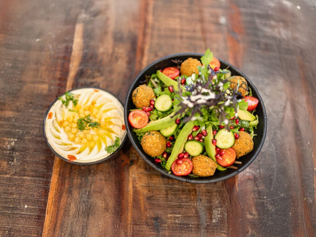 Falafelbällchen mit frischem Salat, Avocado und cremigem Hummus, verfeinert mit hochwertigem Olivenöl.